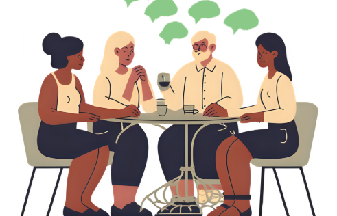 "alt_text": "Graafinen kuva eri maalaisista ihmisistä juttelemassa pöydän ääressä",
