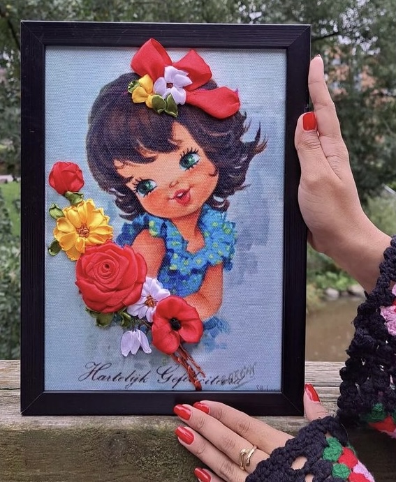 "alt_text": "Punakyntiset kädet pitelevät mustakehyksistä taulua jossa on kuvattu maalattu tyttö. Tytöllä on tumma tukka ja sininen mekko. Päälle on ommeltu erilaisia kukkia ja rusetteja.",