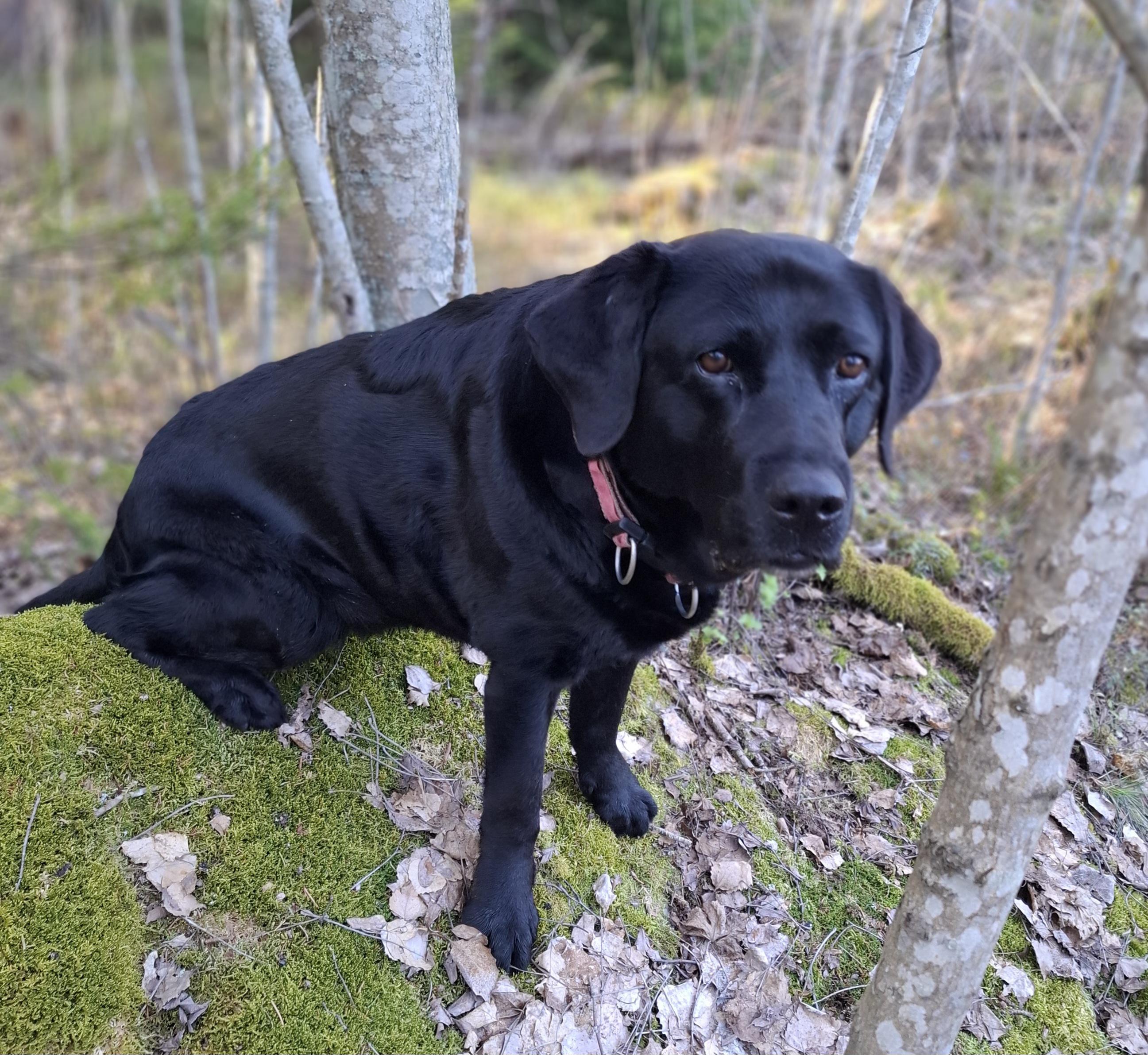 "alt_text": "Kuvassa lukukoira Fila metsässä.",