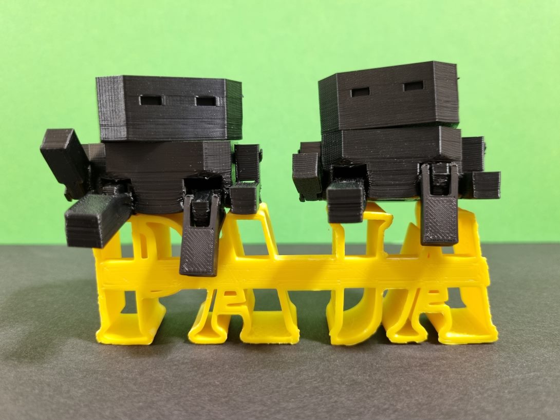 "alt_text": "Kaksi 3D-tulostettua hahmoa 3D-tulostetun kyltin päällä, jossa lukee PAJA.",