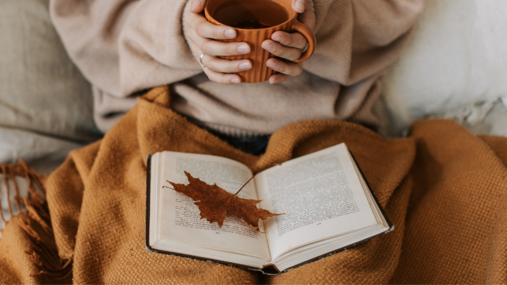 "alt_text": "Person holding a cup, open book on teir lap. On the book lays an orange leaf.",
