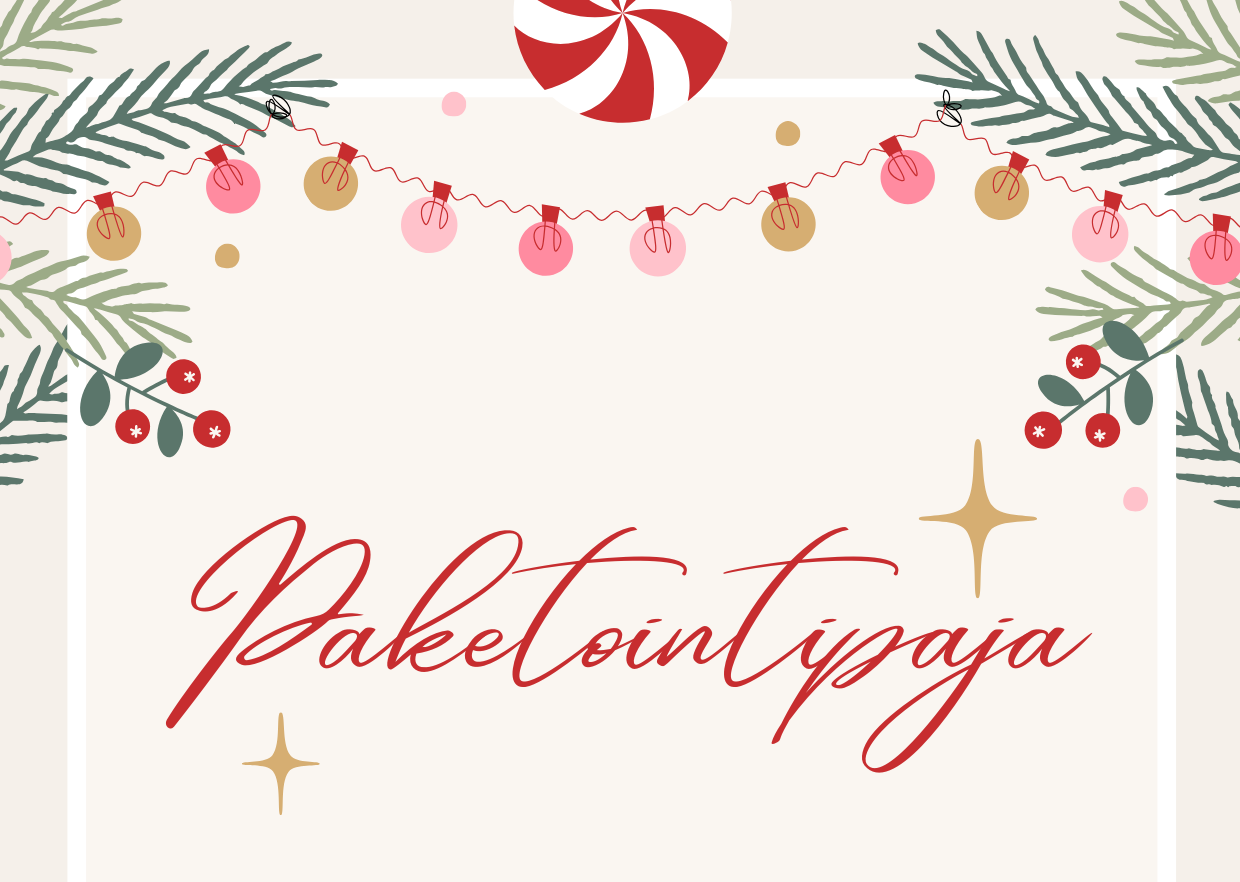 "name": "Kuvassa on jouluteemainen juliste, jossa lukee paketointipaja.",