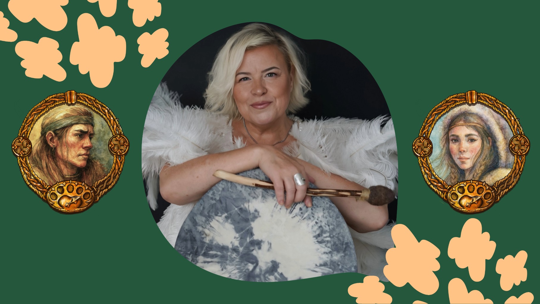 "alt_text": "Kuvituksia kirjasta Pöllö ja Gebo, sekä kuva kirjailija Susanna Lavikaisesta, jossa hänellä on sylissään rumpu ja rumpukapula. Lavikaisella on asussaan isoja sulkia.",