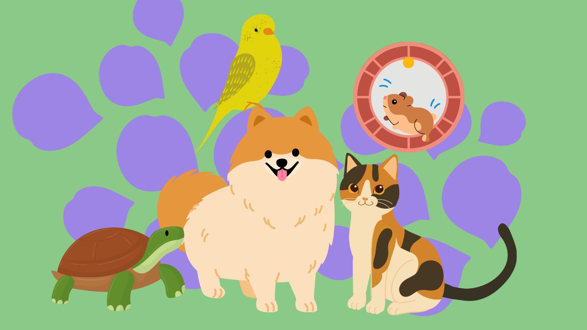 "alt_text": "Värikkäässä kuvassa kilpikonna, koira, papukaija, kissa ja hamsteri",