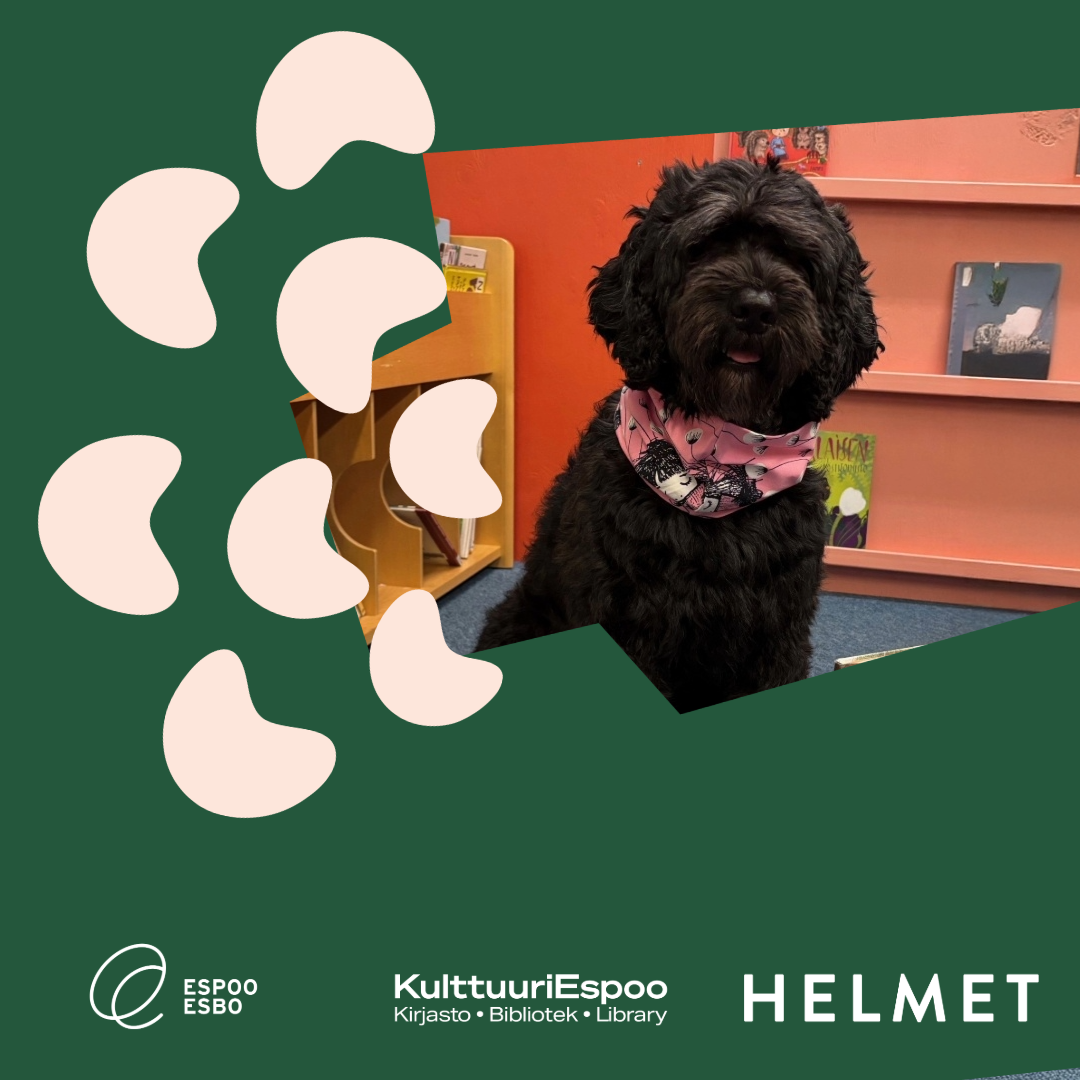 "alt_text": "Musta koira pinkki bandana huivi kaulassa kirjaston lasten kirjahyllyjen edessä.",