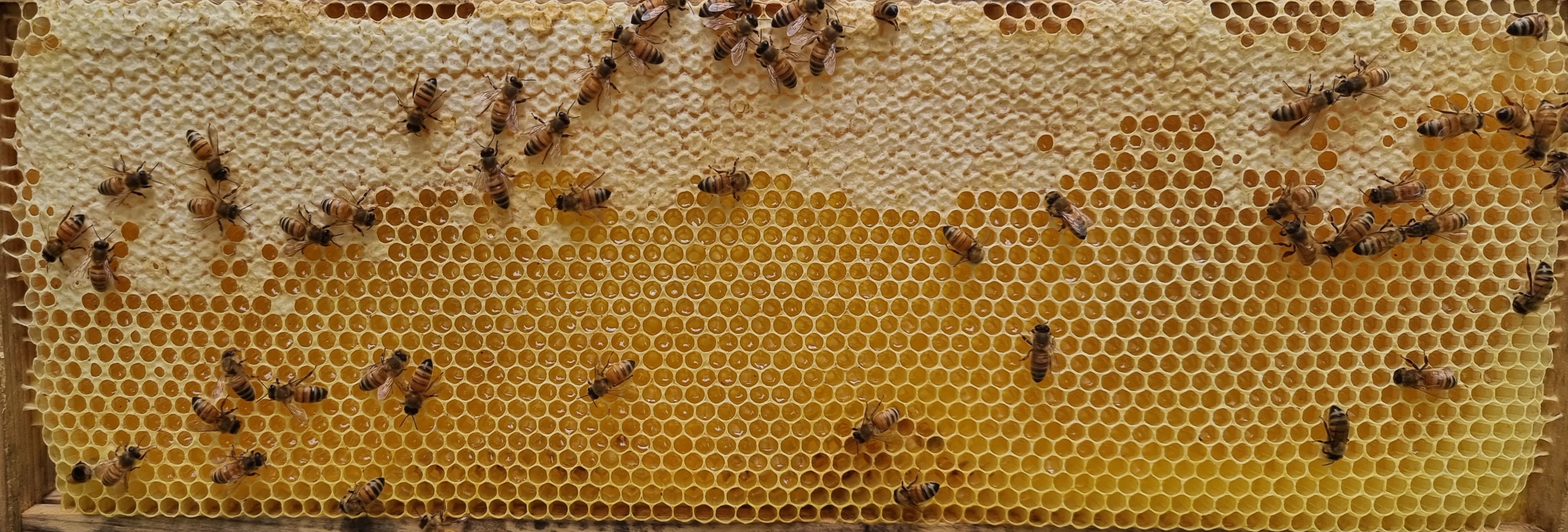 "alt_text": "Kuvassa on hunajakenno ja mehiläisiä",