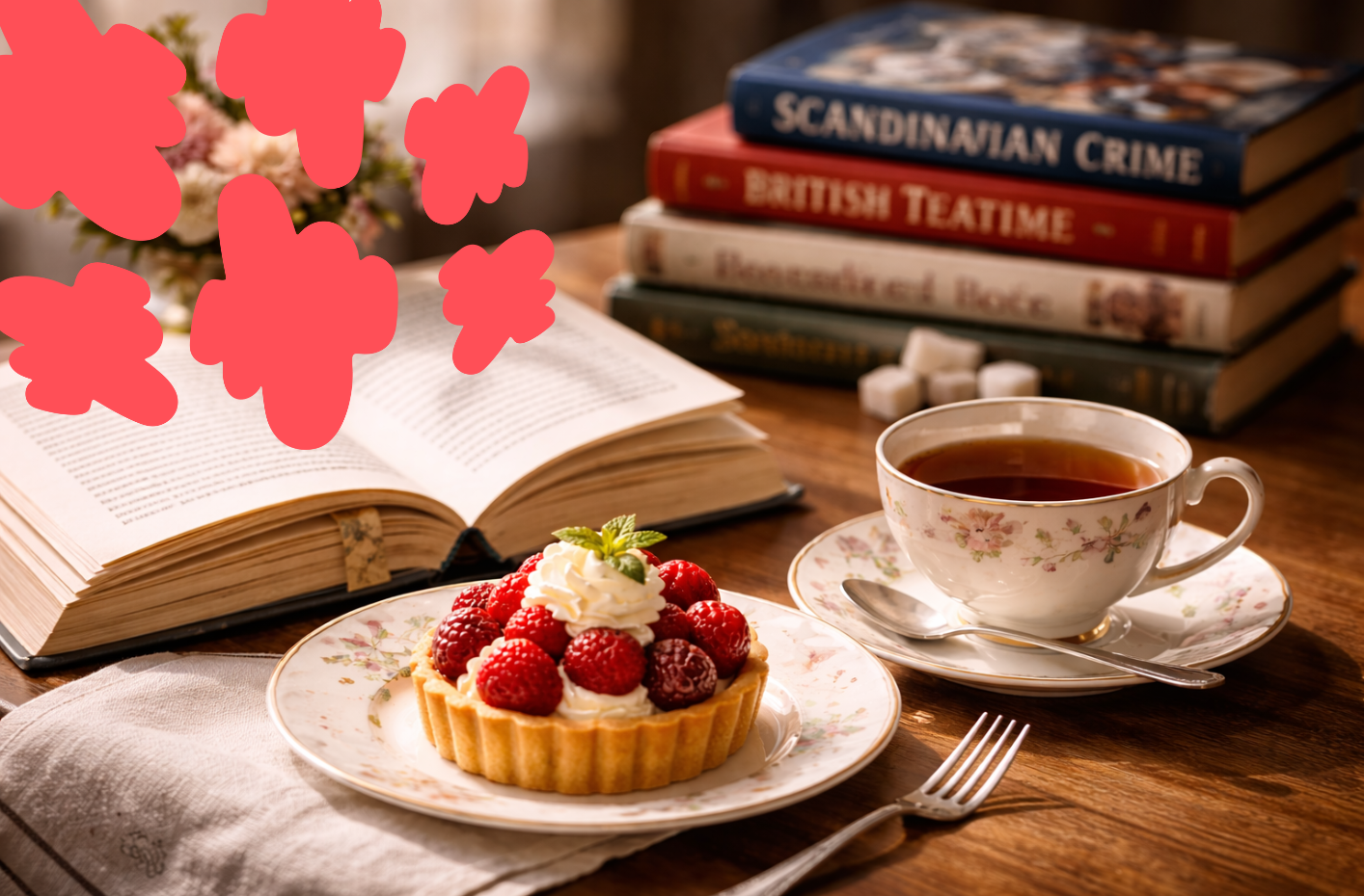 "alt_text": "Pöytä missä leivos, teekuppi ja kirjoja.",