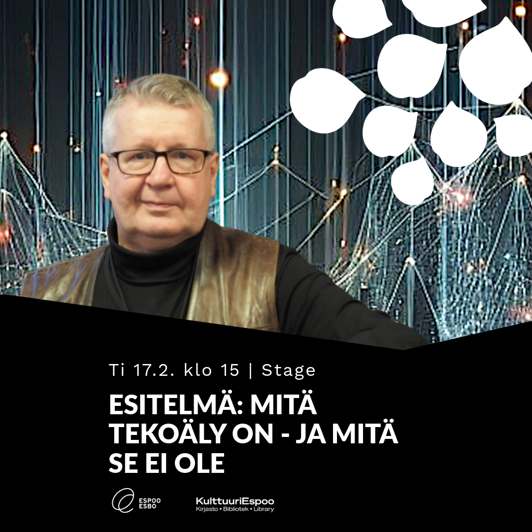 "alt_text": "Eino Uikkanen AI:n tekemää futuristista taustaa vasten. teksti: ti 17.2. klo 15. Esitelmä: Mitä tekoäly on ja mitä se ei ole.",