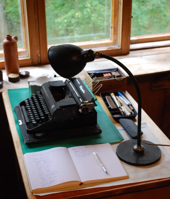 "alt_text": "Kuvassa on työpöytä ja kirjoituskone",