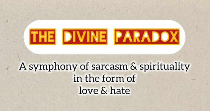 "alt_text": "Kuvassa lukee englanniksi: The divine paradox - a symphone of sarcasm & spirituality in the form of love & hate",