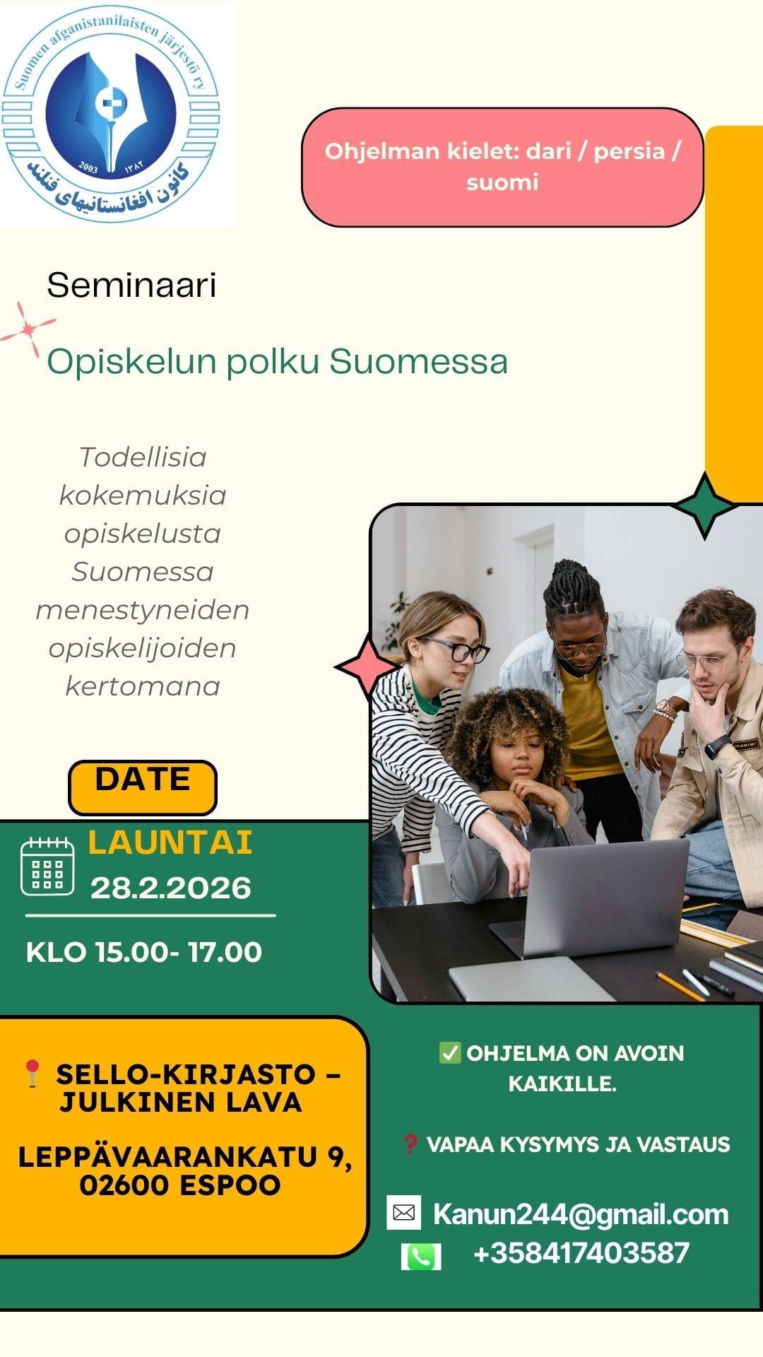 "alt_text": "Joukko nuoria tietokoneen ääressä ja tapahtuman tiedot",