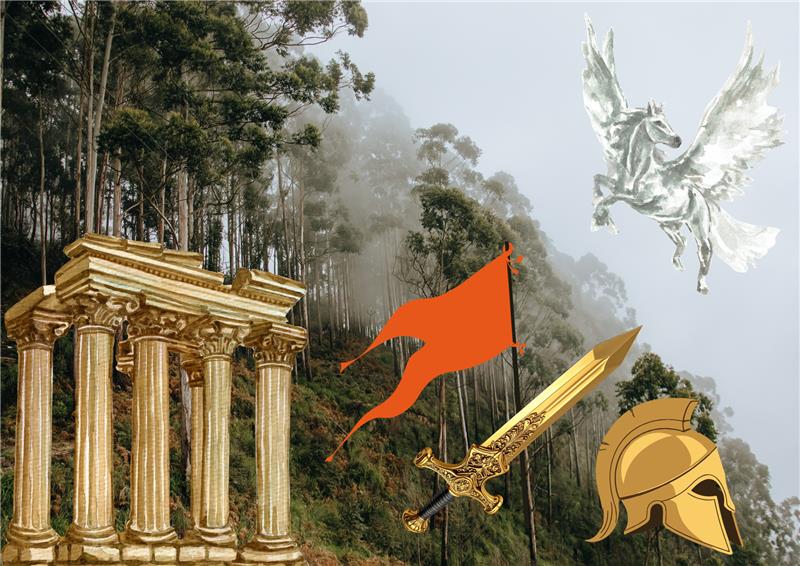 "alt_text": "Sumuinen metsä taustalla, jonka edustalla kreikkalaistyylinen temppeli, punainen lippu, miekka, kreikkalainen sotilaskypärä, sekä lentävä pegasus.",