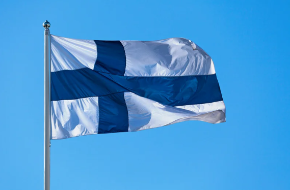 "alt_text": "Kuvassa suomenlippu sinistä taivasta vasten",