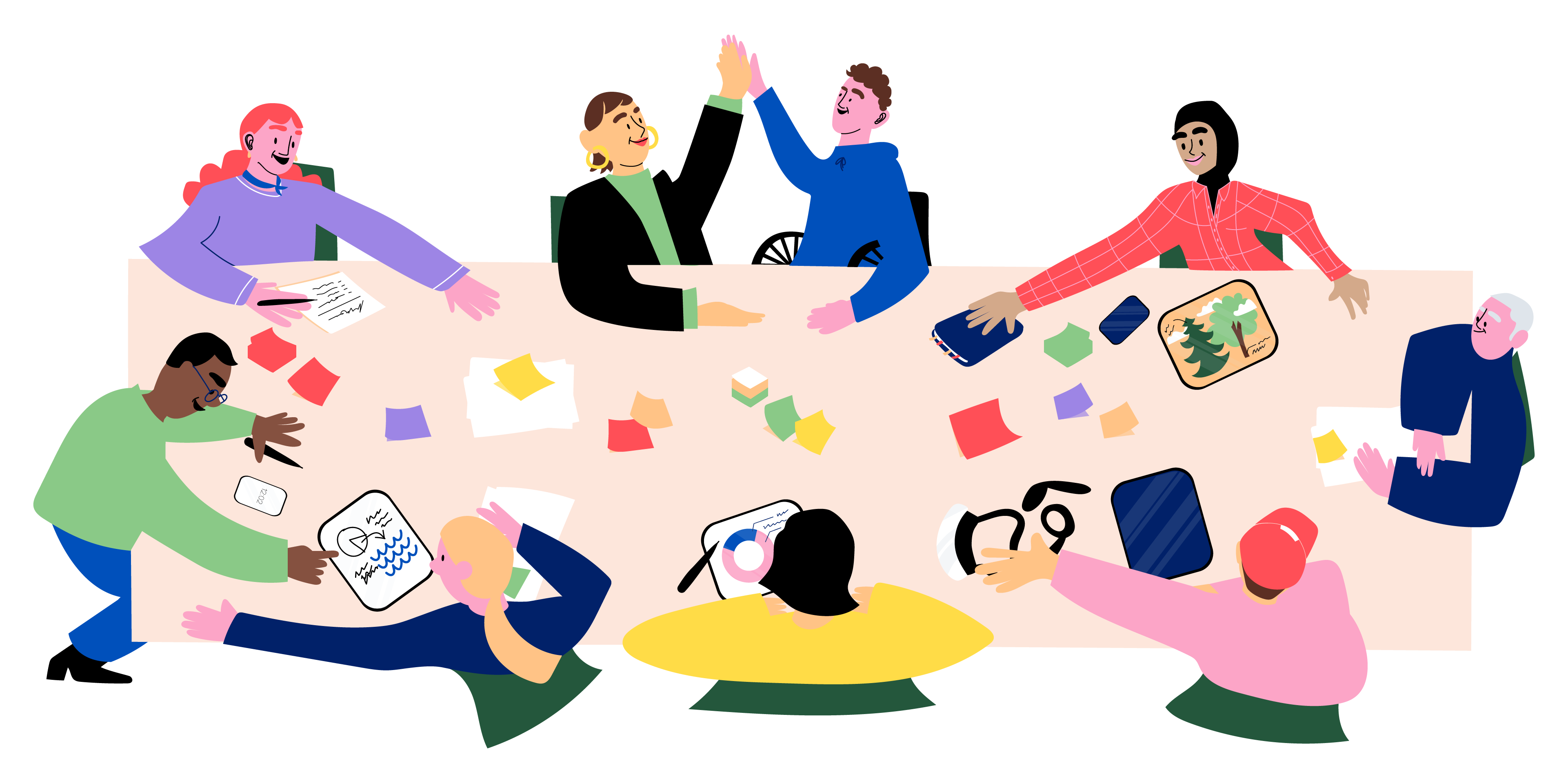 "alt_text": "Piirroskuva, jossa erilaisia ihmisiä suuren pöydän ääressä. Pöydällä pieniä lappuja ja kuvia, ihmiset piirtävät ja kaksi heistä lyö kättä.",